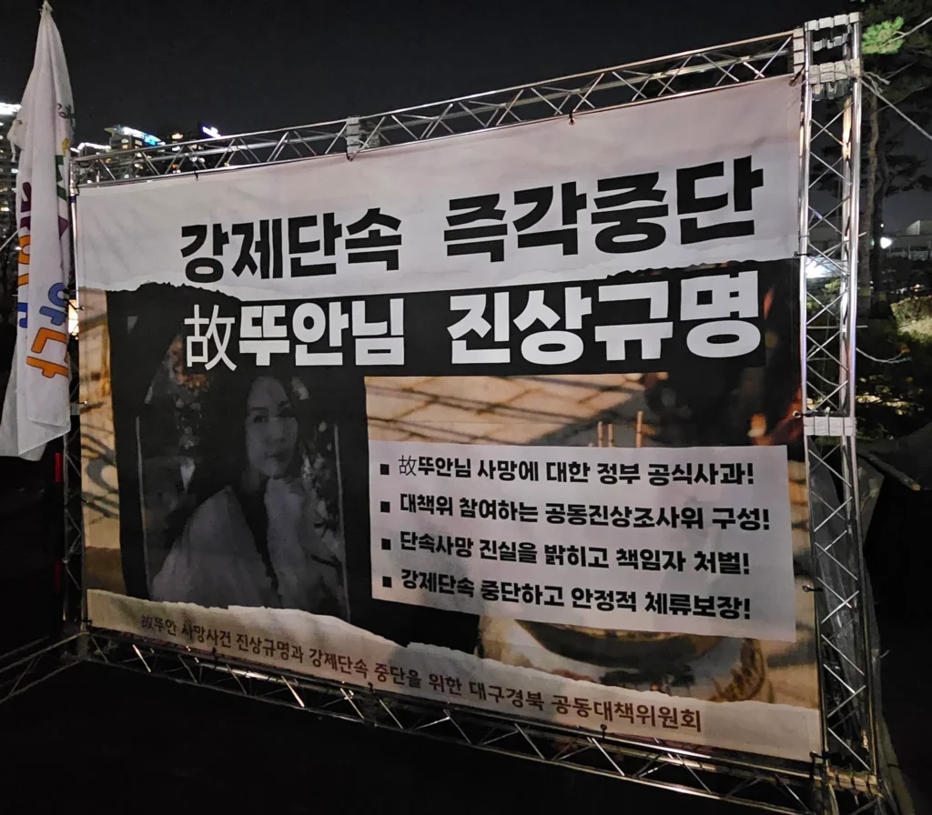 뚜안(가명)은 베트남에서 온 유학생이다, 이주 노동자다, 비정규직 노동자다. 그리고 여성이다. 그는 지난 10월 28일 출입국관리사무소의 위협적인 단속 과정에서 대구 성서공단 공장 3층 건물 틈으로 추락사하였다. 이재명 정권하에서 진상조사는 아직 이뤄지지 않고 있다. 이번 죽음에 대해서 법무부는 자신들의 행위를 덮기 위해서인지 진실을 밝힐 수 있는 자료조차 공개하지 않고 있다. 그리고 법무부에게 지휘 명령 내릴 수 있는 유일한 상급자는 이재명 대통령이다.