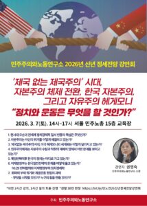 민주주의와노동연구소는 “구체적인 정세에 구체적인 개입”으로서의 이론을 지향하며, 신년 정세정세전망 분석으로 한해를 시작합니다. 2025년 “세계는 어디서 어디로 가고 있는가?” 란 화두로 강연회를 열었고, 2026년은 “위기와 한계속에서 정치와 운동은 무엇인가?”라는 질문을 던지려고 합니다.