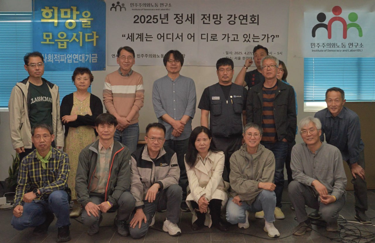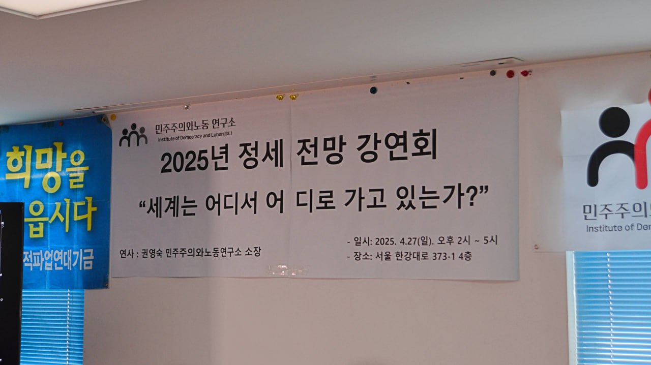 2025년 4월 27일 민주주의와노동연구소는 이 주제로 2025년 정세전망 강연을 열었다. 강연자인 권영숙 민주주의와노동연구소 소장은 “세계는 어디서 어디로 가고 있는가?” 라는 질문에 대하여 9개의 하위 질문들을 내놨다.