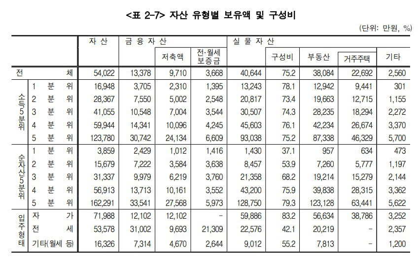 표4) 한국의 분위별 가계 자산액 및 구성비