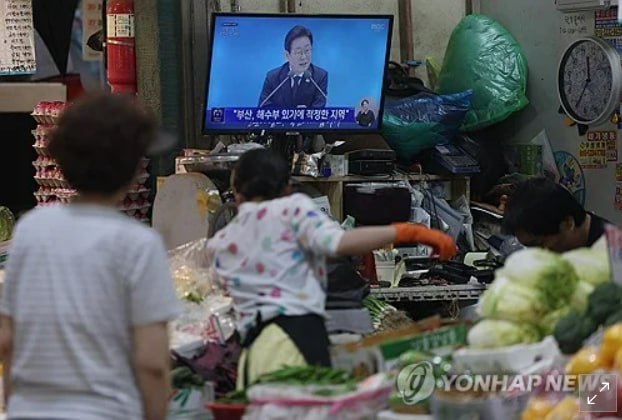 6월 3일 서대문 시장 상인들이 이재명 기자회견을 TV로 시청하고 있다. 출처 : 네이트뉴스
