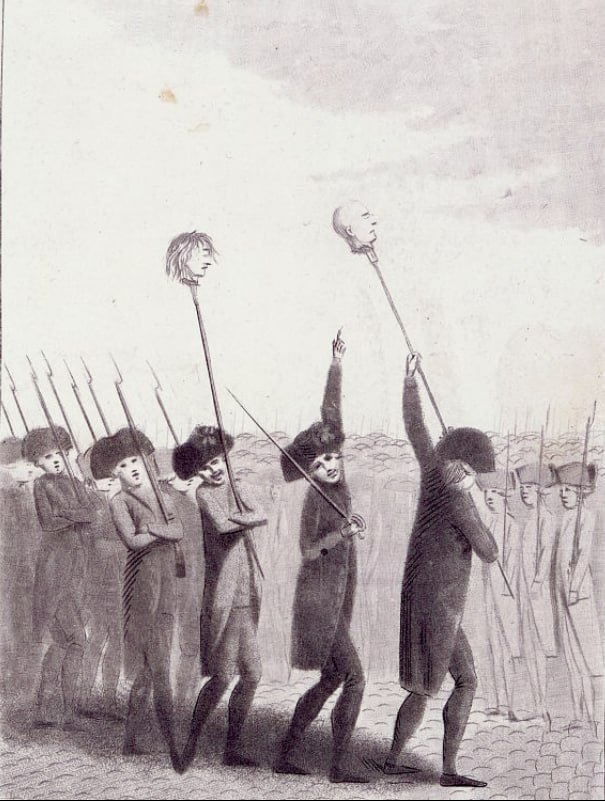 1789년 프랑스 시위대가 바스띠유 감옥을 습격한 뒤 수비대장과 파리시장을 참수하고 창에 걸어 효수한 장면을 그린 판화