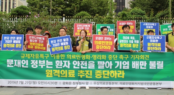 의료민영화 저지와 무상의료 실현을 위한 운동본부·의료민영화 저지 범국민운동본부는 2019년 “강원도 원격의료 사업을 중단하라”고 촉구했다. (사진제공: 보건의료노조, 출처: 의협신문http://www.doctorsnews.co.kr)