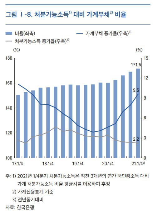 게다가 한국은행 자료를 보면, 가계부채 증가율은 높아지는 반면에 오히려 처분가능소득(즉 부채 및 이자를 갚을 수 있는 현금 능력) 증가율은 낮아지고 있었다.