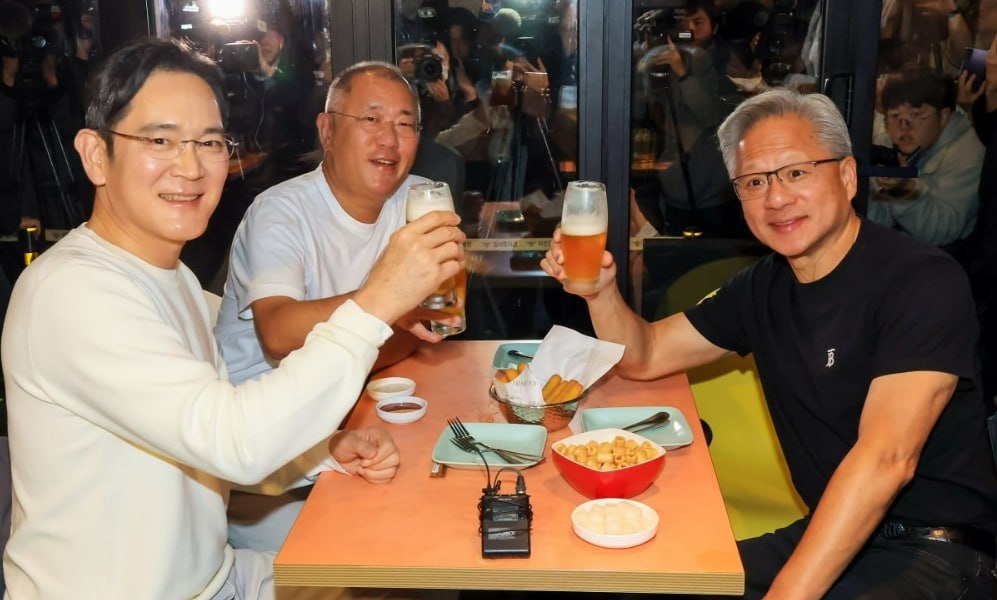 지난 10월 30일 서울 강남 “깐부” 치킨 매장에서 젠슨 황 엔비디아 CEO와 삼성그룹 이재용 회장, 현대차 정의선 회장이 치맥을 먹고 있다. 이들은 자본가들의 ‘우애’를 보란 듯이 과시했다. 출처: <한국경제신문>