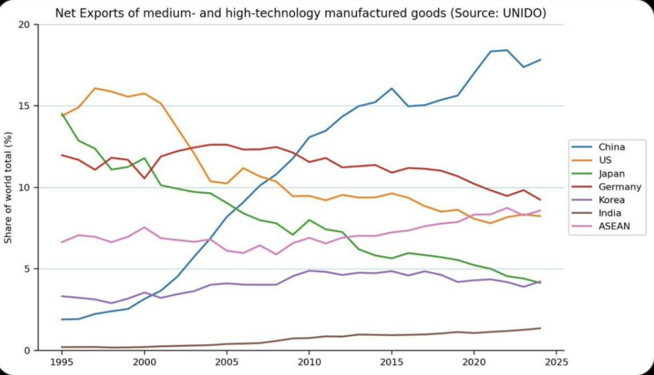 이 챠트에서 가장 흥미로운 것은 일본이다. 1995년만 해도 미국과 더불어 양대 제조업 생산국이던 일본의 고기술 제품의 수출은 전세계 수출시장에서 차지하는 비율이 지속적으로 감소하여 마침내 2024년에는 심지어 한국에도 추월당했다. 실은 일본이야 말로, 이제는 저기술 저임금 수출에 목을 매야 하는 신세가 되었다.