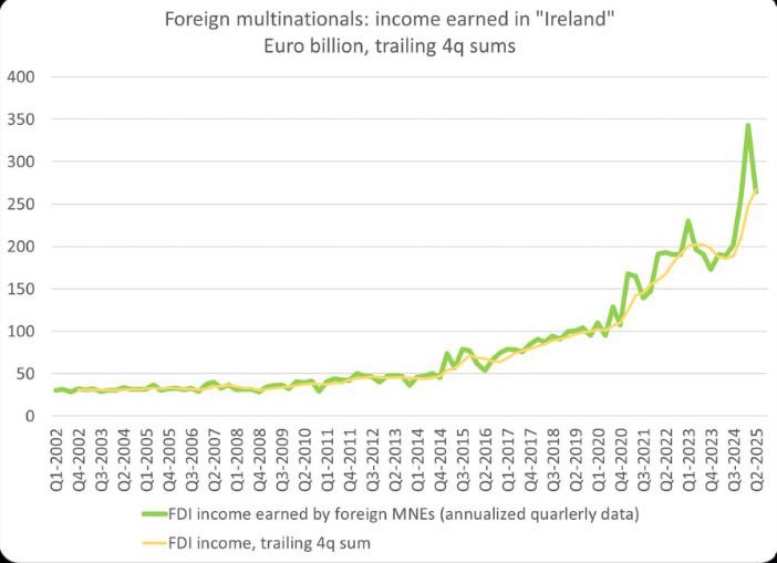아일랜드 소재 다국적 기업들의 이윤은 2025년 2분기 말 기준으로 무려 2500억 유로(1개년 누적)에 달한다. 그럼 이 2500억 유로는 다국적 기업들이 아일랜드에서 영업해서 벌어들인 돈일까? 아니다. 아일랜드에 세계적인 경쟁력을 가진 기업이 뭐가 있는지 단 하나라도 이름을 대보라. 그런 거 없다. 이 돈은 모두 단지 아일랜드에 지사, 법인을 둔 다국적 기업들은 전세계를 상대로 영업을 하여 벌어들인 ‘이윤’이다. 그리고 단지, 회계상으로 아일랜드 소재 지사, 법인의 이윤을 잡힐 뿐이다. 왜냐면 아일랜드가 유럽에서, 그리고 선진국들 가운데 가장 법인세가 낮기 때문이다(15%).