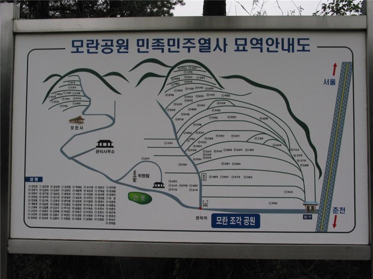 나는 2003년까지는 슬라이드 필름으로 사진을 찍고 2004년부터 디지털카메라를 썼다. 슬라이드 필름으로 찍은 사진 속에 마석모란공원이 어떻게 담겨 있는지 확인하지 못했다. 디지털카메라로 2004년 11월 11일 찍은 사진 가운데 ’모란공원 민족민주열사 묘역 안내도‘가 있다.