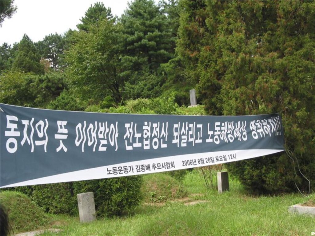 “재벌의 나라에 가난한 노동자로 태어나 / 인간답게 살기를 염원하던 사람 / 폭압의 세월에 목숨바쳐 전노협을 지키고 / 죽어서도 투쟁의 깃발 놓지 않은 노동자 / 살아오라 열사여! / 천만 노동자의 가슴 속 노동해방의 불꽃으로!