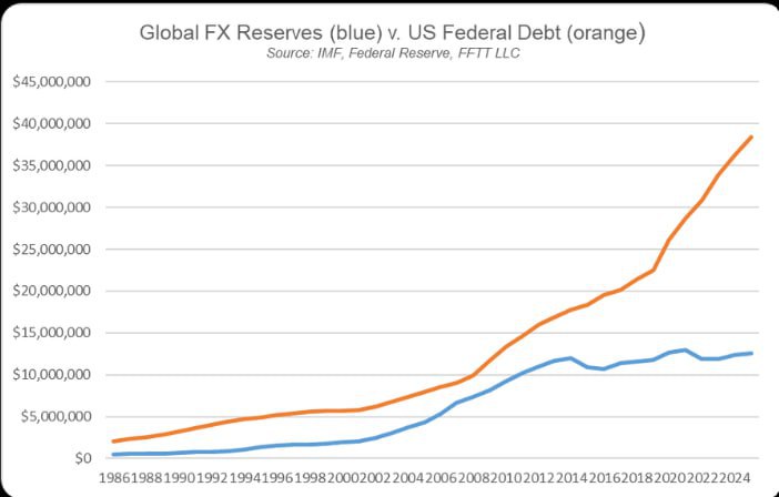 그러나 위의 챠트를 보면 알 수 있듯이 지난 2013년 이후에는 이 비례 관계가 깨어지기 시작했다. 미국의 재정적자는 계속 ‘함수적으로’ 증가하는데 반해, 해외 국가의 외환보유고는 거의 증가하지 않았다(IMF 기준 2014년 2분기 말에 12조 달러에서 2025년 3분기 현재 13조 달러). 이 액수는 여러 통화로 구성된 외환보유고를 달러 환율로 환산한 것이기 때문에 달러 약세기에는 마치 외환보유고가 증가한 것처럼 통계상으로는 나타난다).