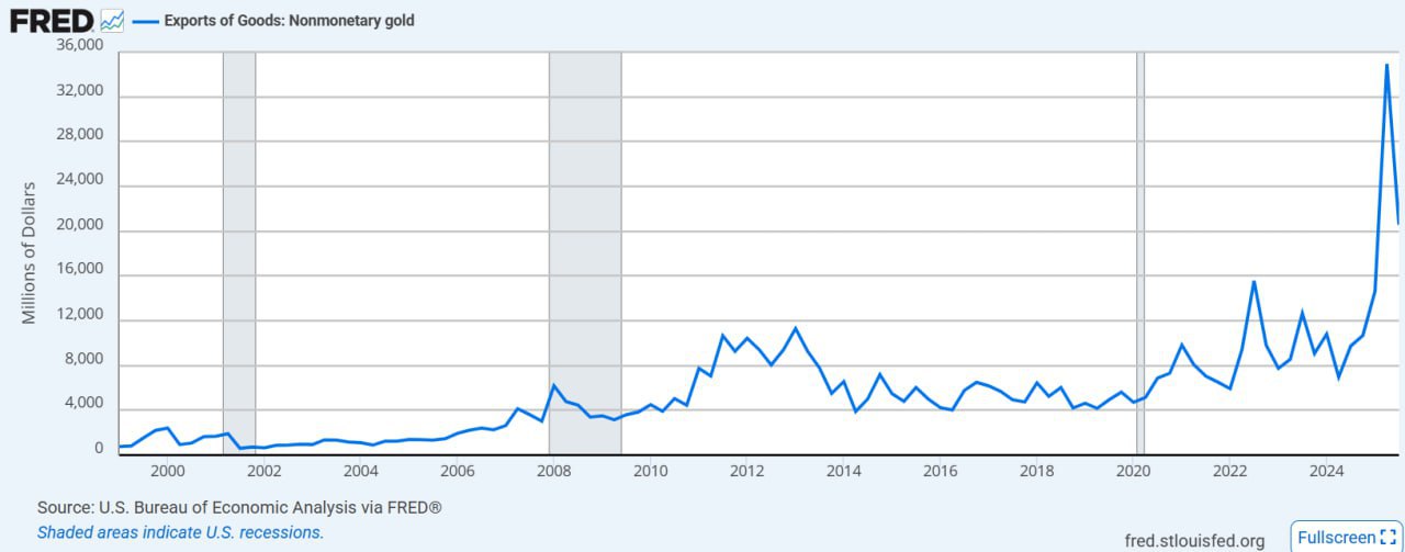 버냉키는 금에 ‘통화적 가치’를 부여하지 않았다. 그는 심지어는 자산으로서의 금의 성격에 대해서도 회의적이었다. 금을 ‘야만적 유물’(barbaric relics)이라고 부른 것은 존 메이너드 케인즈였지만, 버냉키도 그에 못지 않았다. 흥미롭게도 지난 2022년 이후 미국의 금 수출은 급증했다. 지난 2025년 2분기에는 무려 350억 달러에 달했고, 3분기에도 205억 달러를 기록했다. 아직 4분기 통계는 나오지 않았지만, 아마도 연간 1,000억 달러에 육박할 것으로 보인다. 즉 이미 지난 2024년부터 미국은 해외 국가들에게 국채를 파는 것이 아니라, 금을 팔았다.