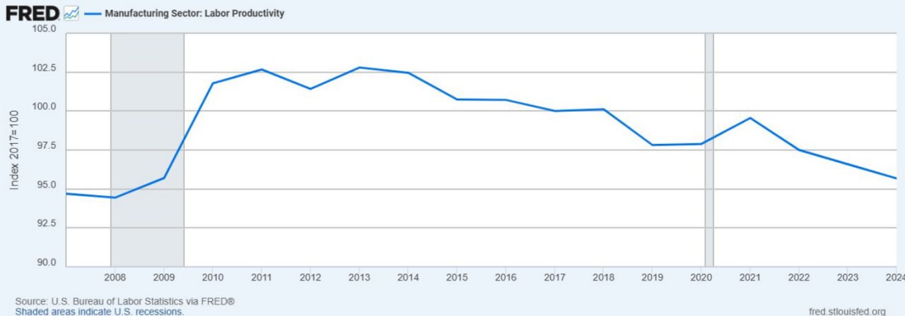 미국의 노동생산성은 상승하기는커녕, 오히려 하락하고 있는 중이다. 생산성이 감소한다는 것은 장기적인 성장률 전망치가 감소한다는 것을 의미한다. 즉, 이유가 뭐가 되었든 미국은 쇠락 중이다. 더 이상 미국은 천조국이 아니다.