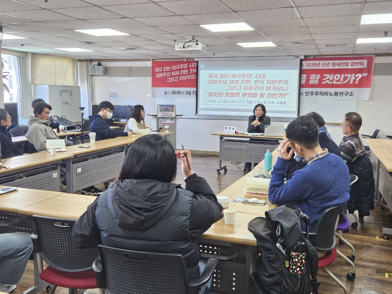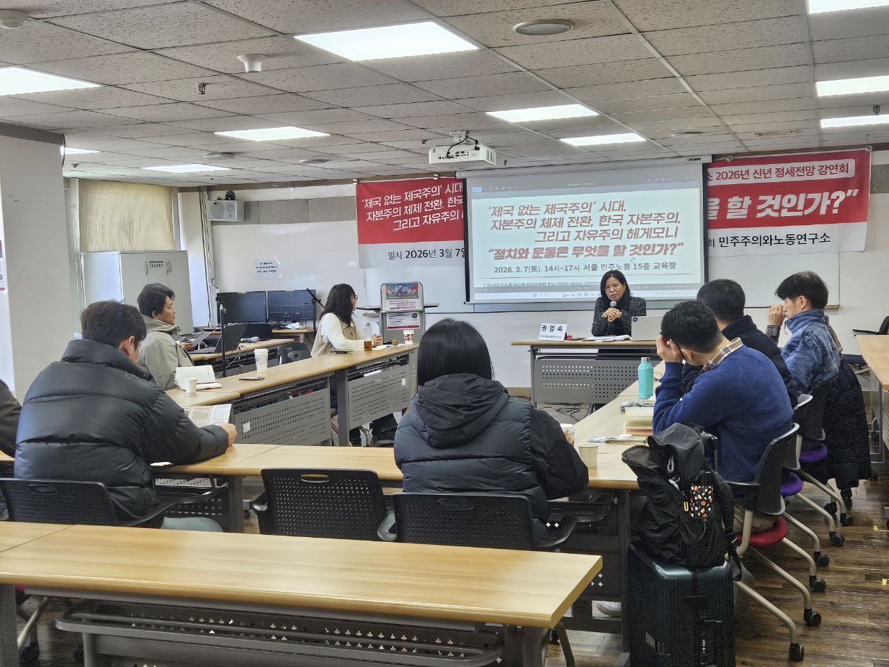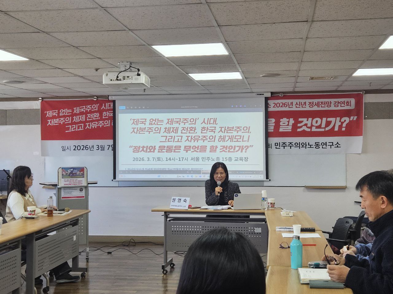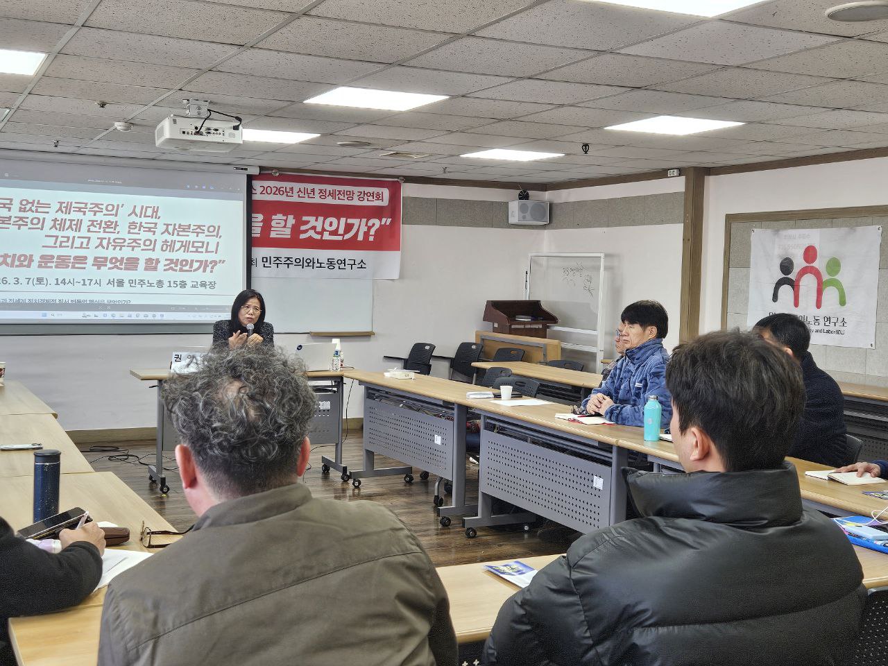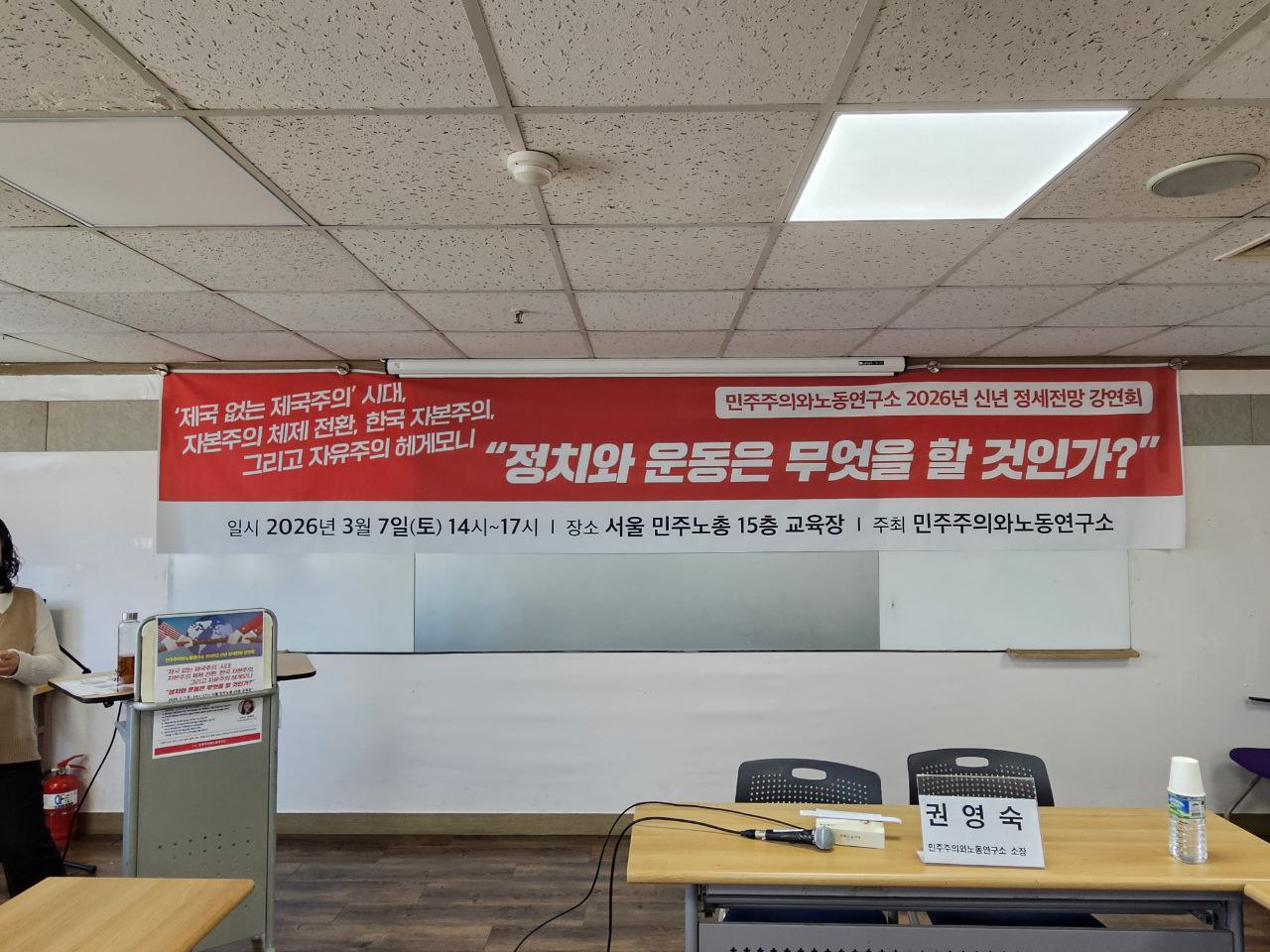 민주주의와노동 연구소의 2026년 신년정세전망 강연 및 토론이 지난 3월 7일 서울 민주노총 교육장에서 진행되었습니다. ‘제국 없는 제국주의 시대, 자본주의 체제전환과 한국 자본주의, 그리고 자유주의 헤게모니’라는 주제로 강연을 해주신 권영숙 소장님과 함께 고민을 나눠주신 모든 동지들께 깊은 감사의 인사를 전합니다.