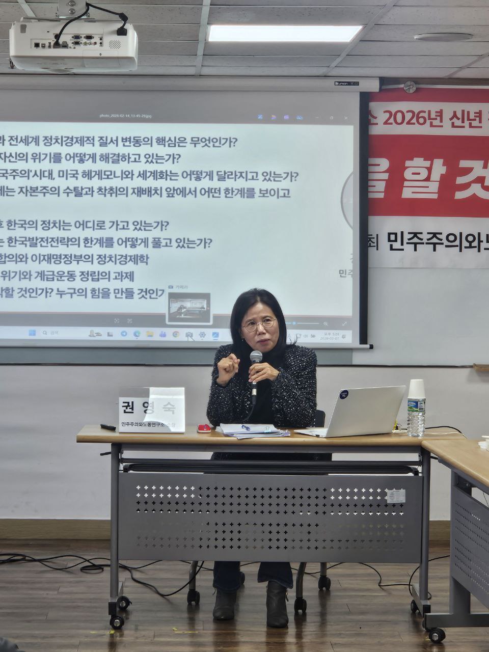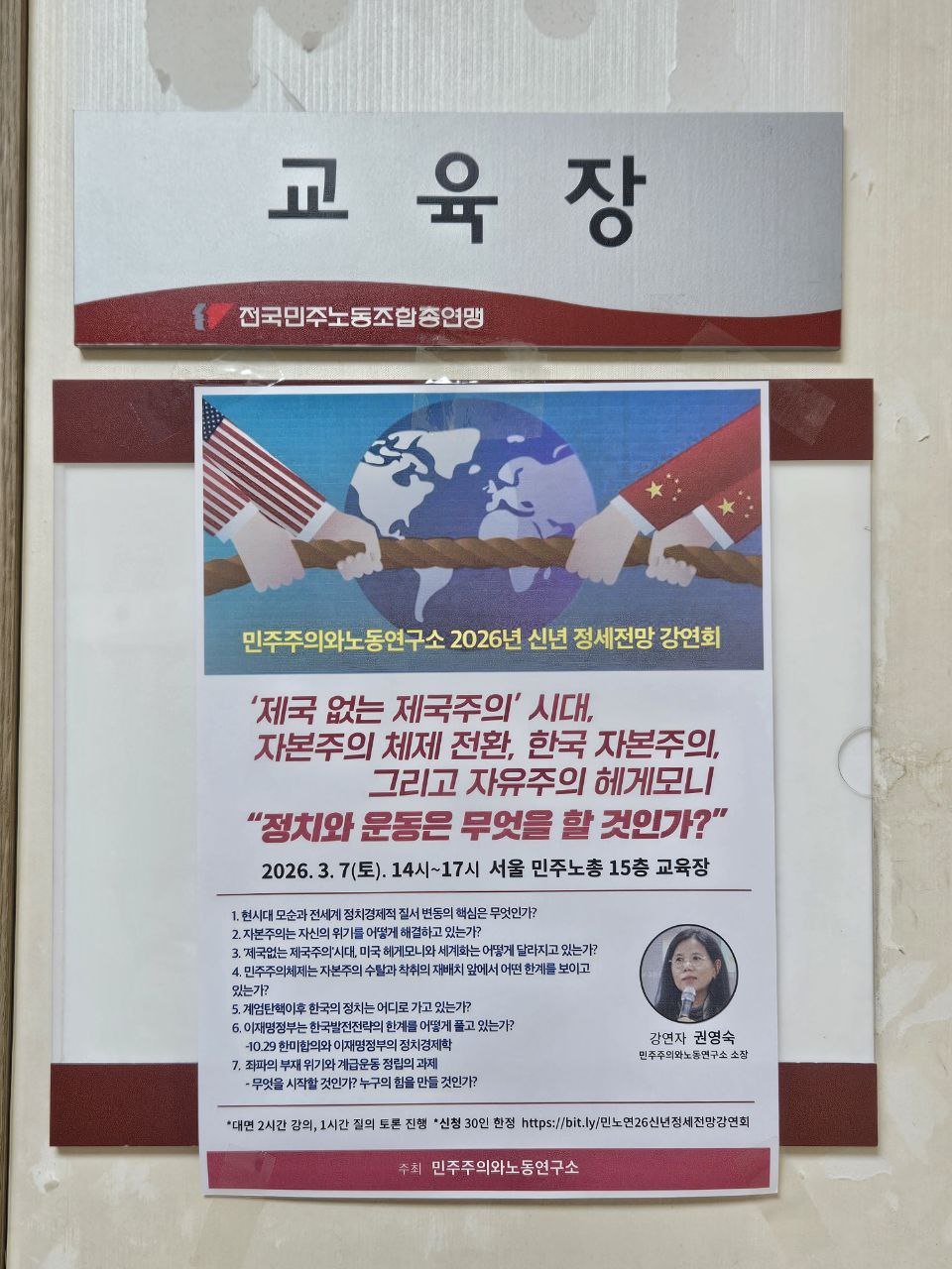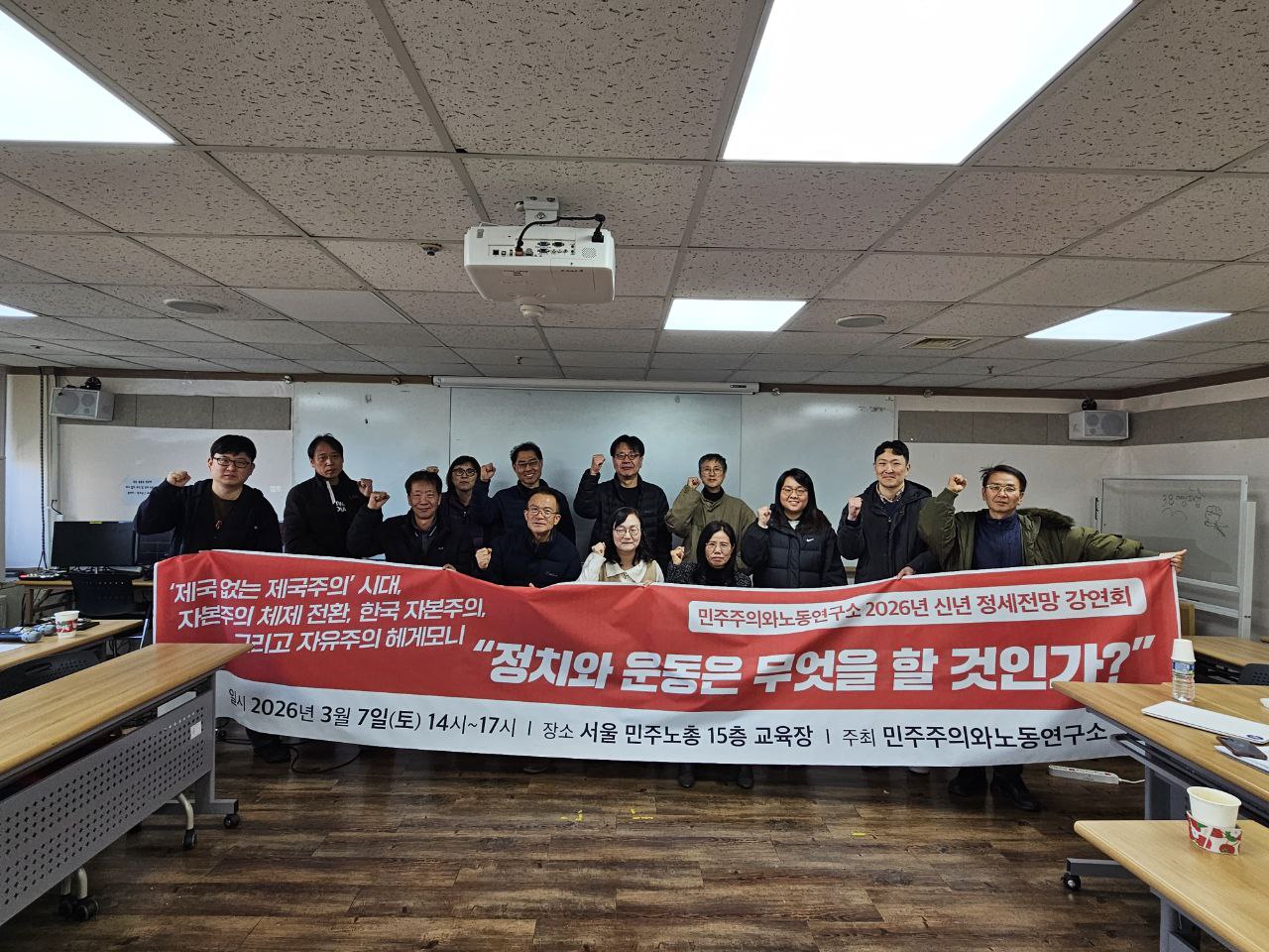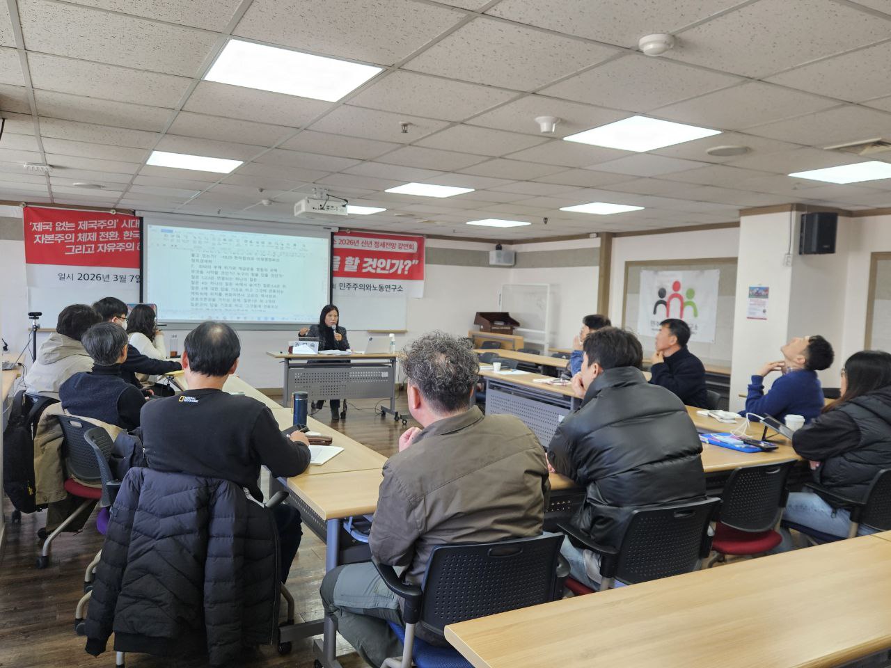 민주주의와노동 연구소의 2026년 신년정세전망 강연 및 토론이 지난 3월 7일 서울 민주노총 교육장에서 진행되었습니다. ‘제국 없는 제국주의 시대, 자본주의 체제전환과 한국 자본주의, 그리고 자유주의 헤게모니’라는 주제로 강연을 해주신 권영숙 소장님과 함께 고민을 나눠주신 모든 동지들께 깊은 감사의 인사를 전합니다.
