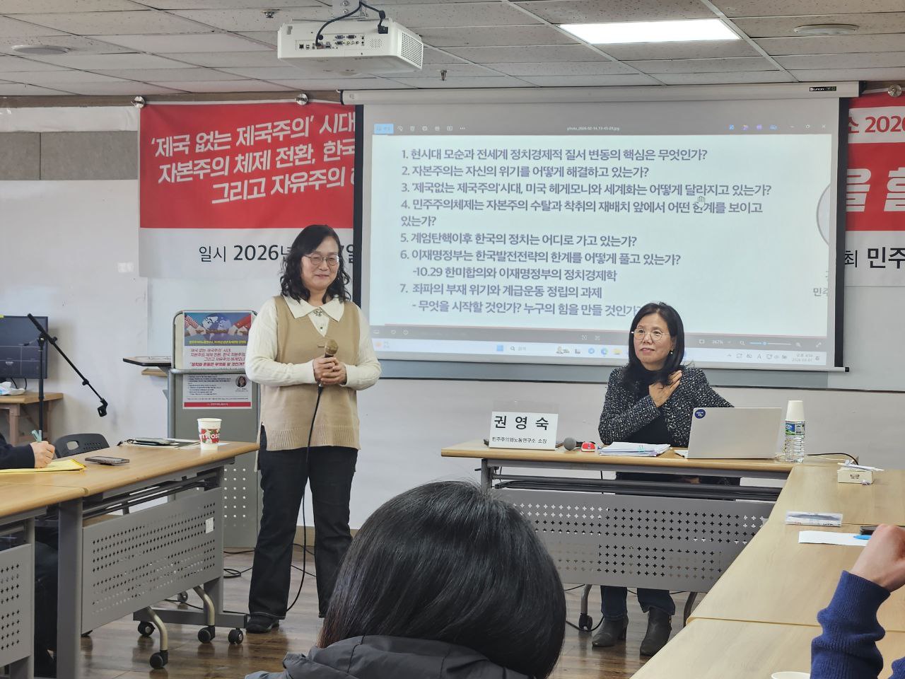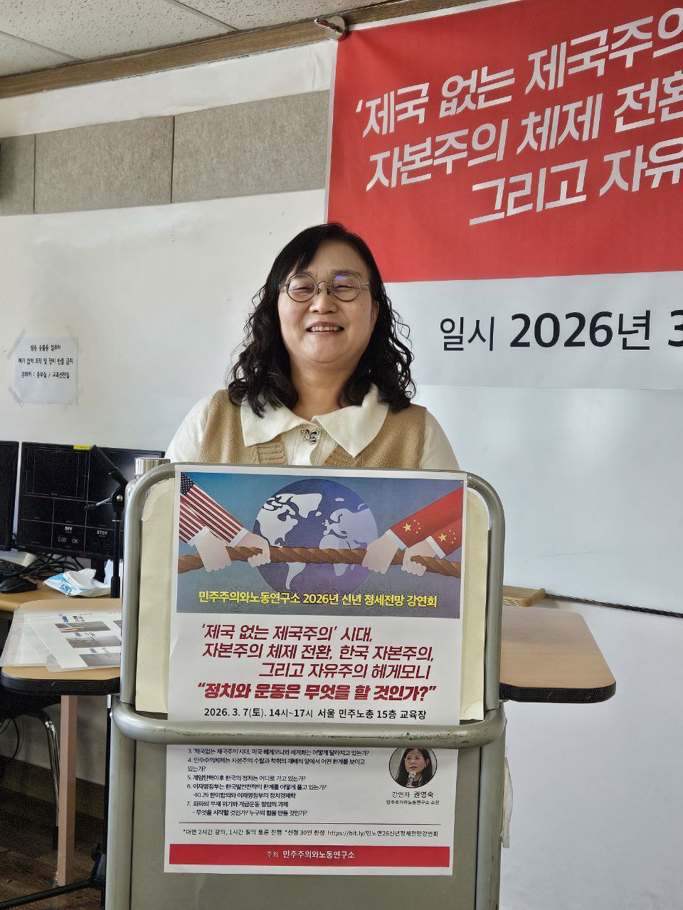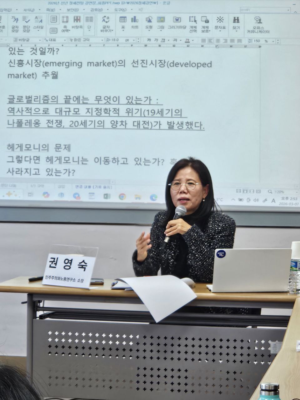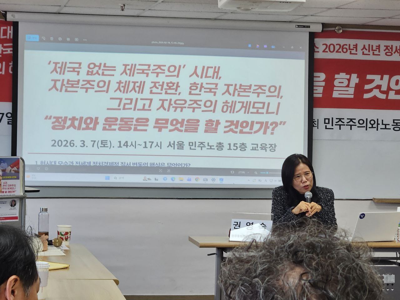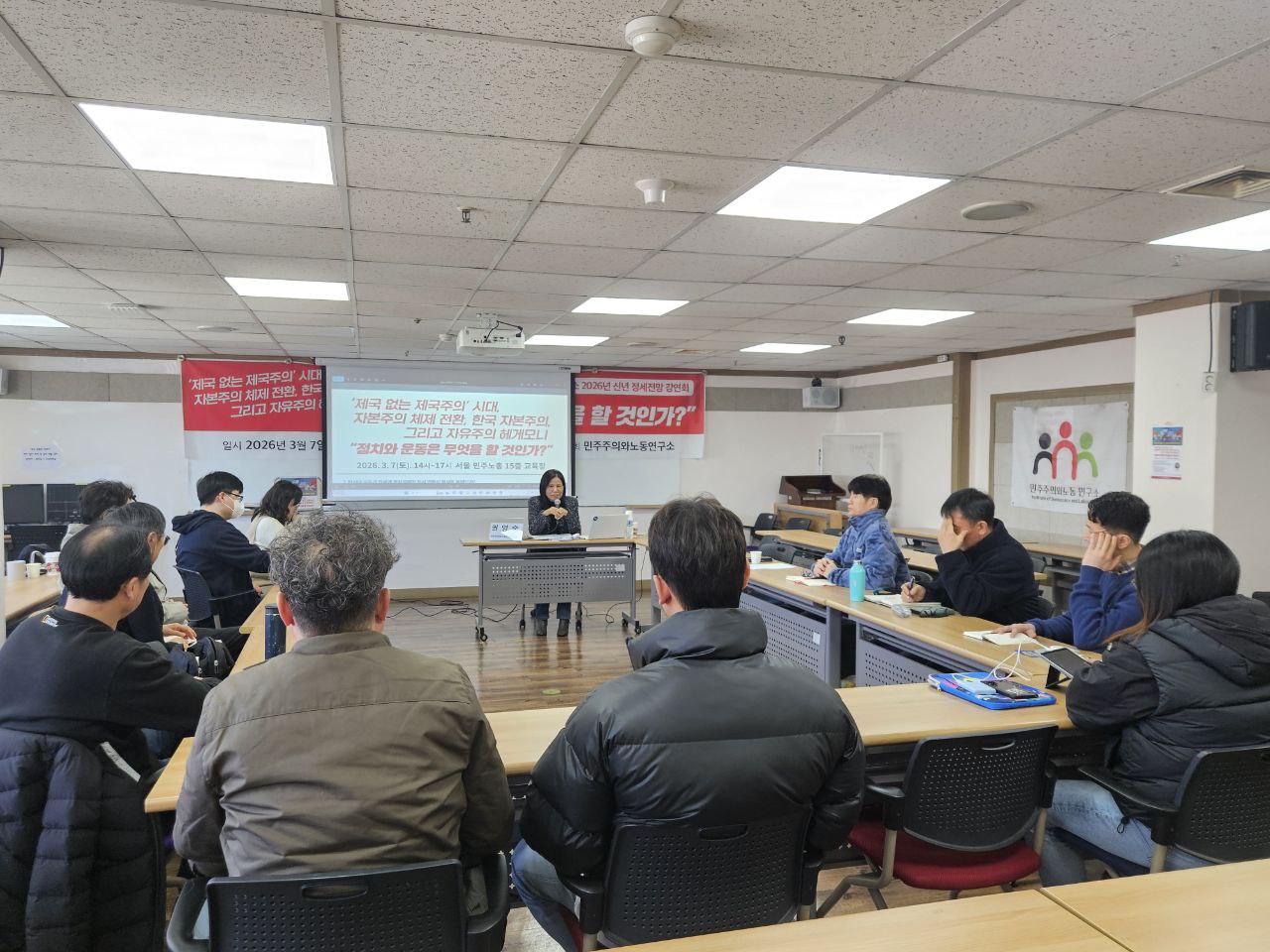 민주주의와노동 연구소의 2026년 신년정세전망 강연 및 토론이 지난 3월 7일 서울 민주노총 교육장에서 진행되었습니다. ‘제국 없는 제국주의 시대, 자본주의 체제전환과 한국 자본주의, 그리고 자유주의 헤게모니’라는 주제로 강연을 해주신 권영숙 소장님과 함께 고민을 나눠주신 모든 동지들께 깊은 감사의 인사를 전합니다.