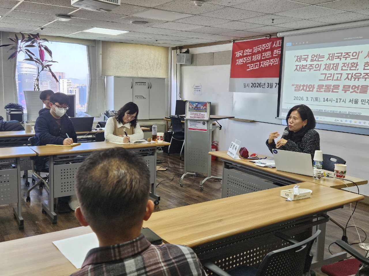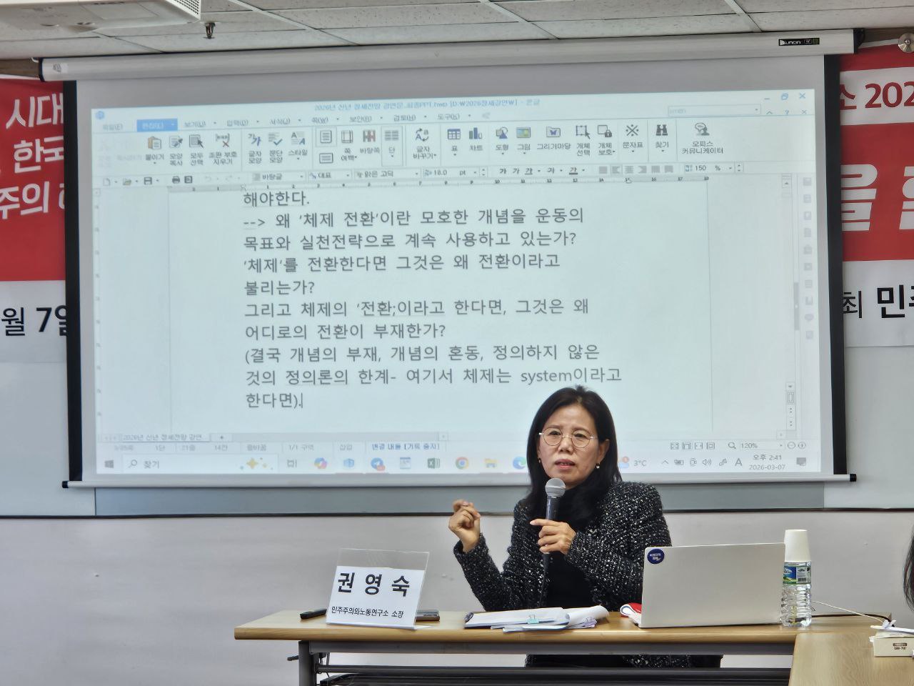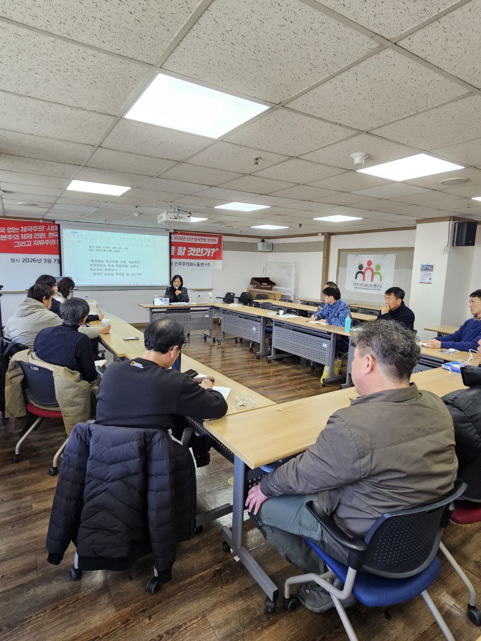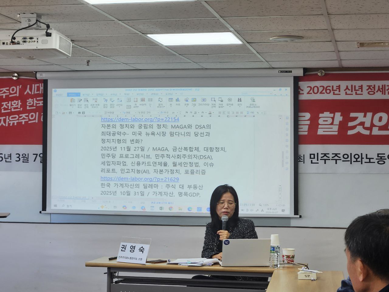민주주의와노동 연구소의 2026년 신년정세전망 강연 및 토론이 지난 3월 7일 서울 민주노총 교육장에서 진행되었습니다. ‘제국 없는 제국주의 시대, 자본주의 체제전환과 한국 자본주의, 그리고 자유주의 헤게모니’라는 주제로 강연을 해주신 권영숙 소장님과 함께 고민을 나눠주신 모든 동지들께 깊은 감사의 인사를 전합니다.