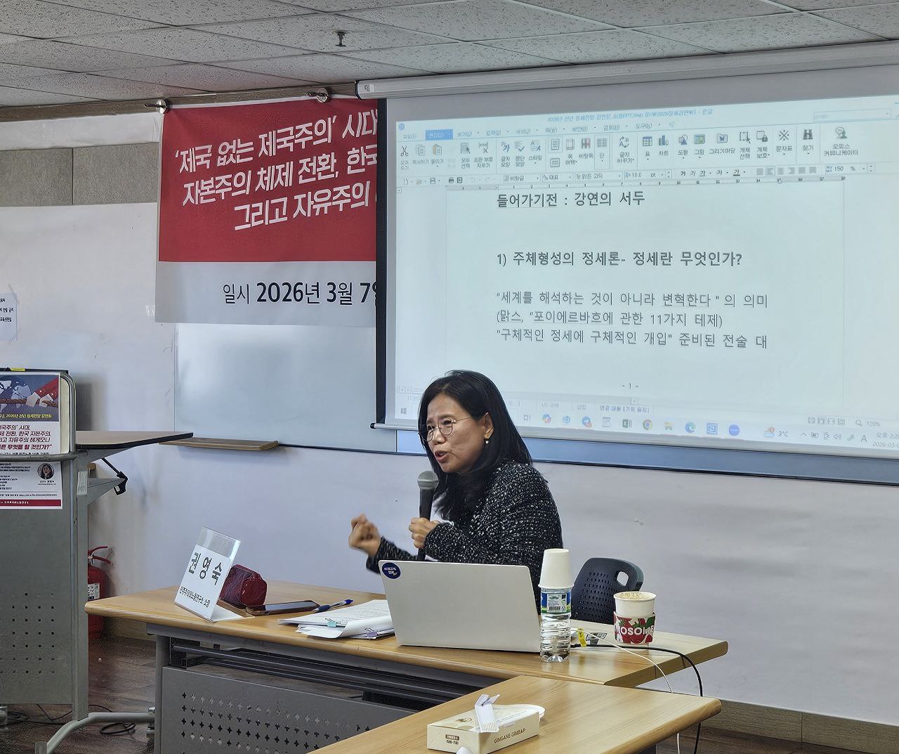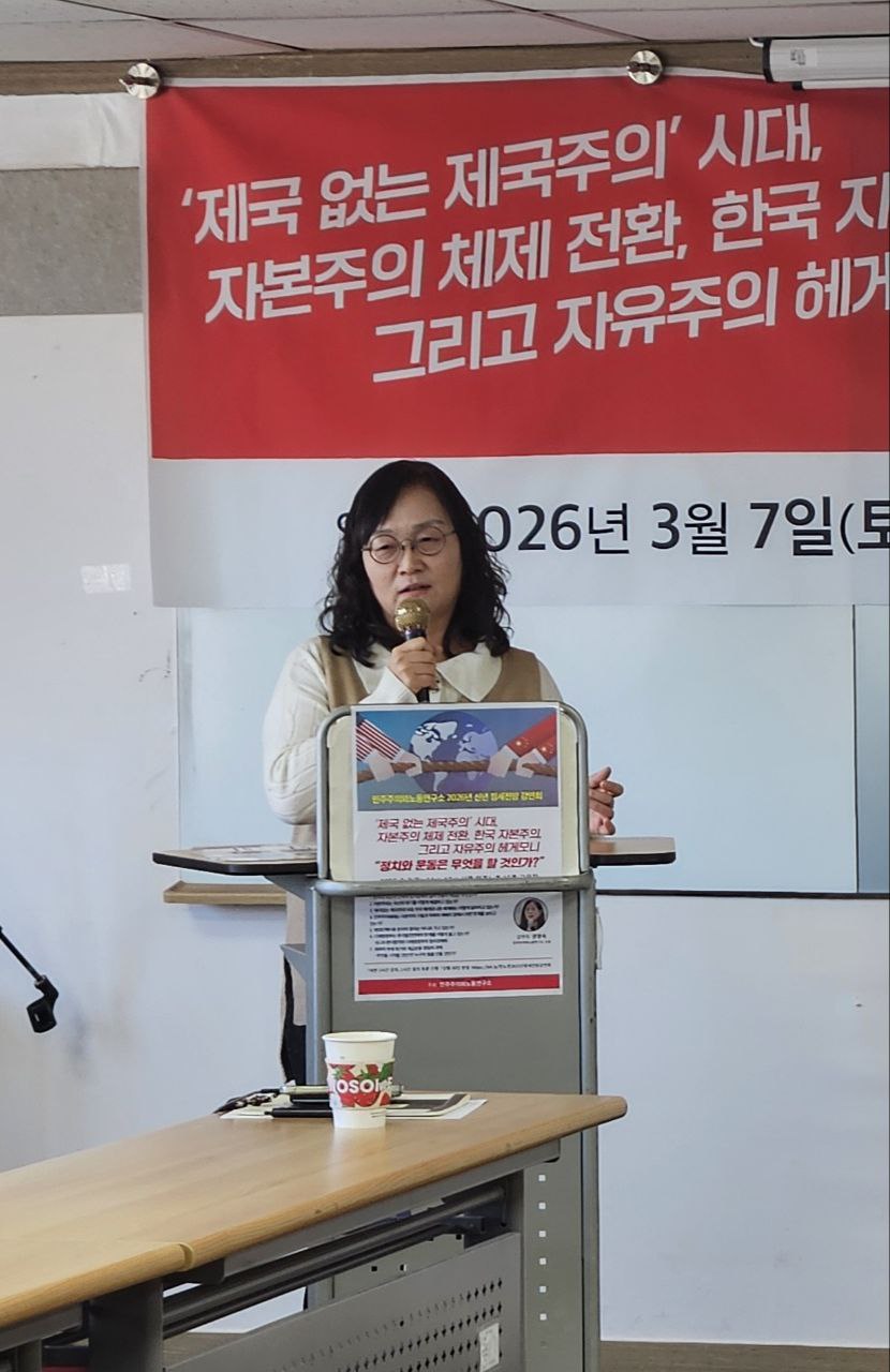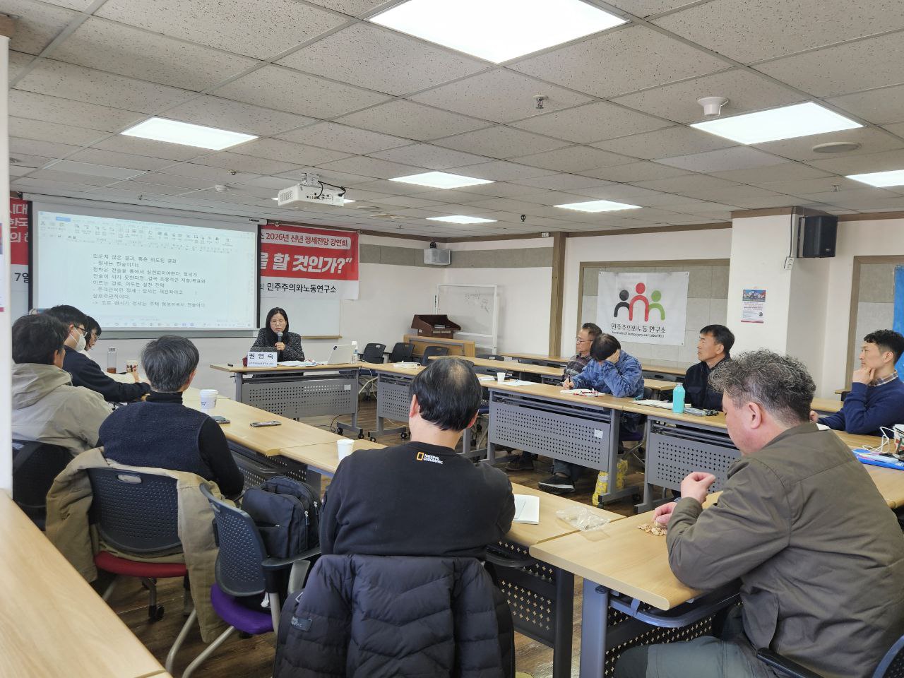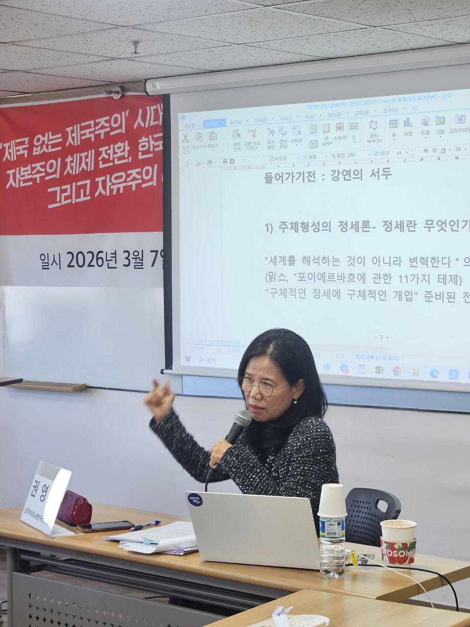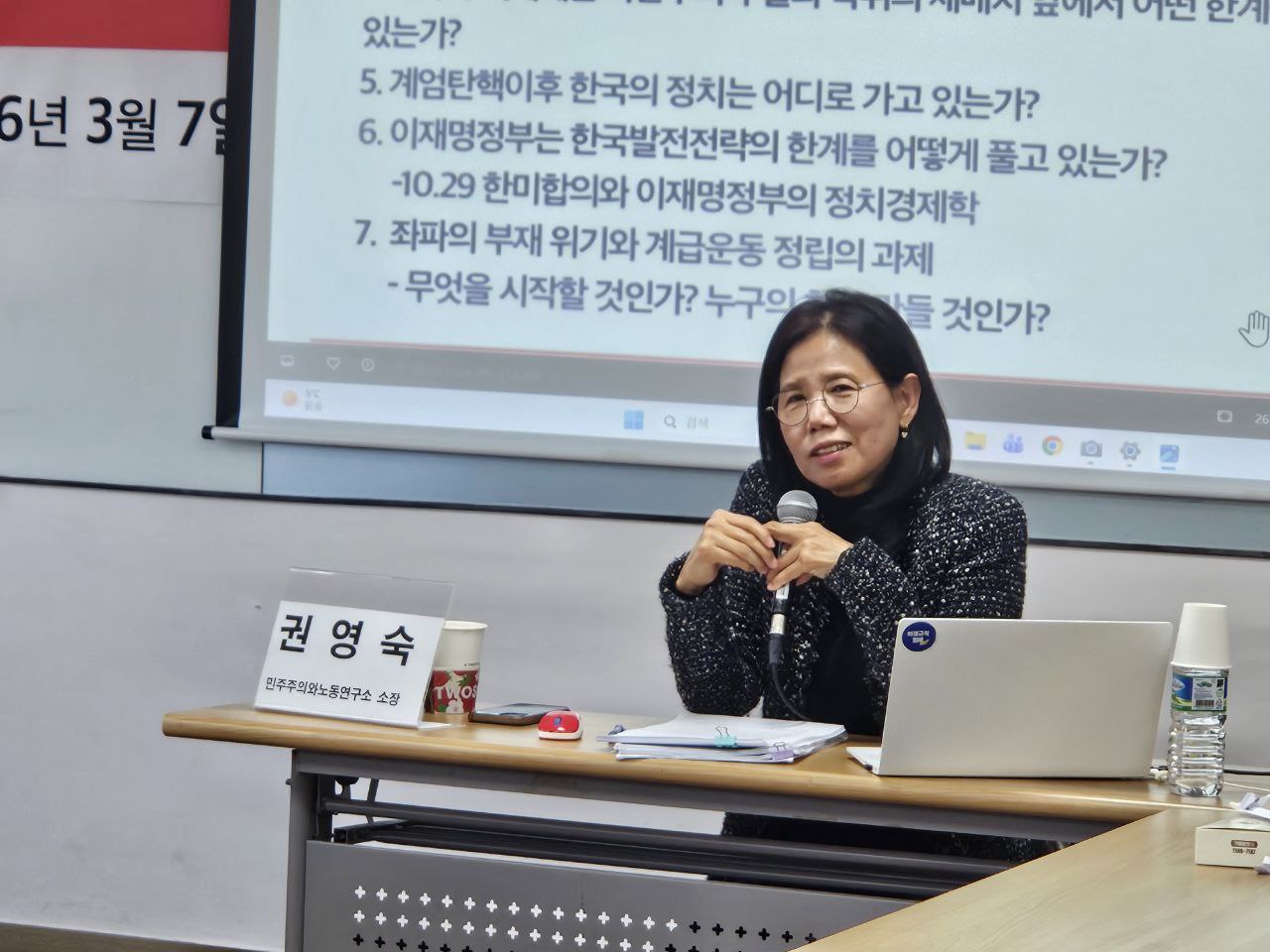 민주주의와노동 연구소의 2026년 신년정세전망 강연 및 토론이 지난 3월 7일 서울 민주노총 교육장에서 진행되었습니다. ‘제국 없는 제국주의 시대, 자본주의 체제전환과 한국 자본주의, 그리고 자유주의 헤게모니’라는 주제로 강연을 해주신 권영숙 소장님과 함께 고민을 나눠주신 모든 동지들께 깊은 감사의 인사를 전합니다.