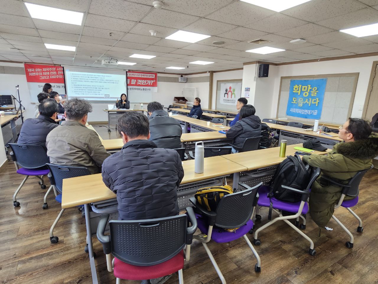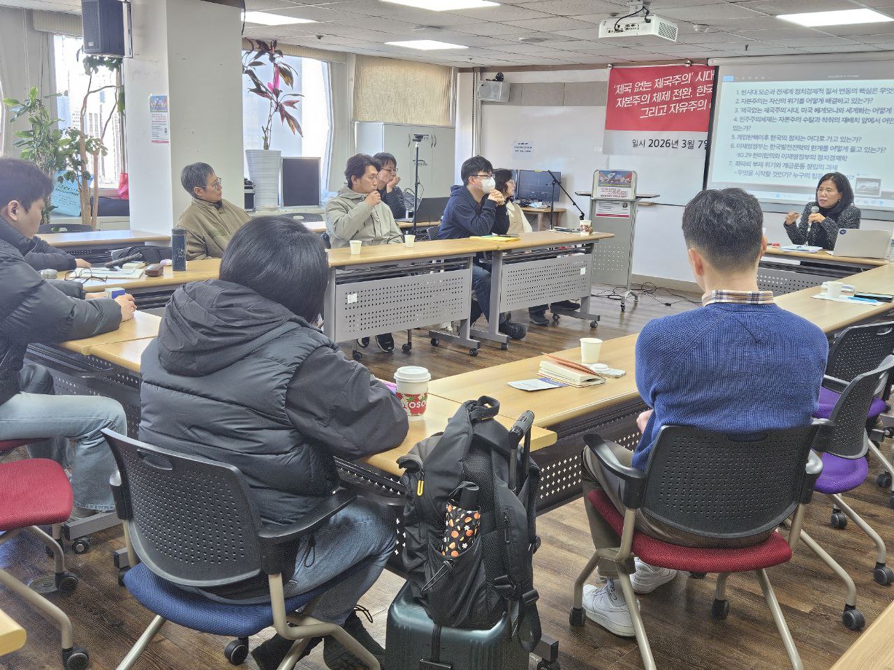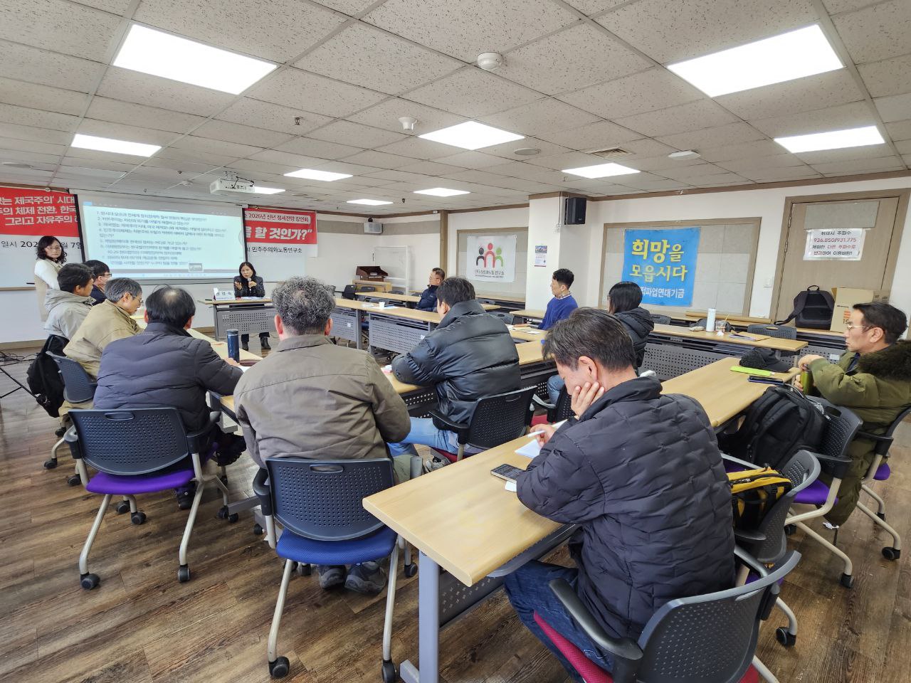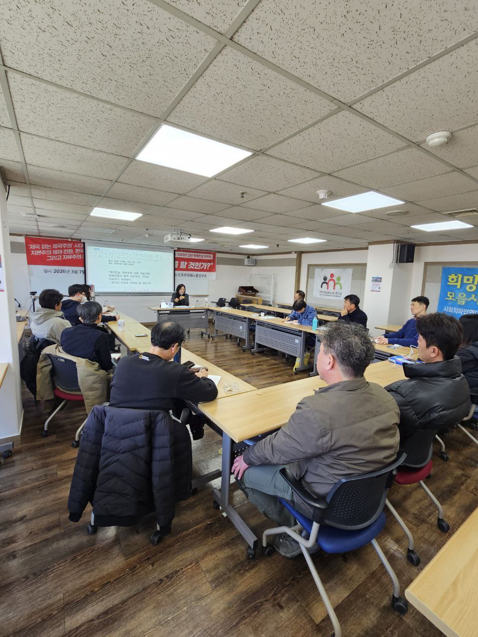 민주주의와노동 연구소의 2026년 신년정세전망 강연 및 토론이 지난 3월 7일 서울 민주노총 교육장에서 진행되었습니다. ‘제국 없는 제국주의 시대, 자본주의 체제전환과 한국 자본주의, 그리고 자유주의 헤게모니’라는 주제로 강연을 해주신 권영숙 소장님과 함께 고민을 나눠주신 모든 동지들께 깊은 감사의 인사를 전합니다.