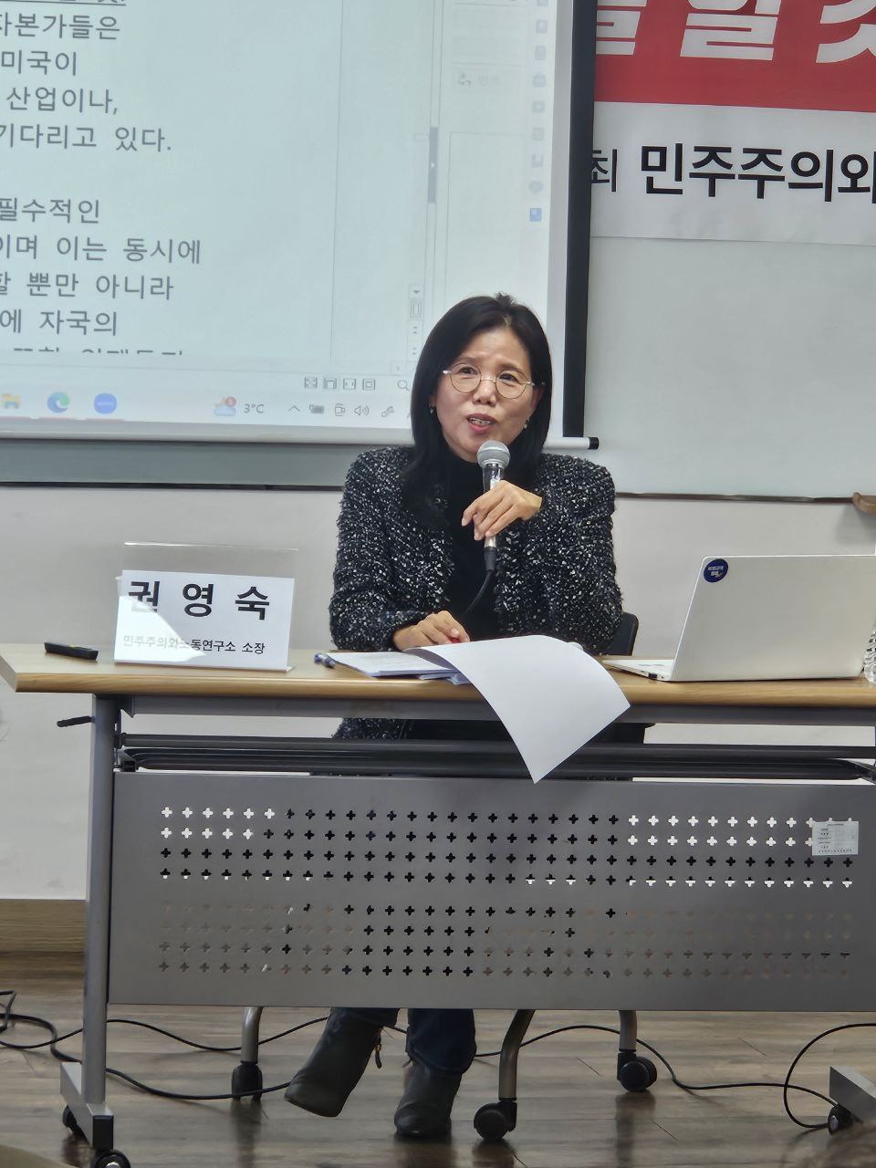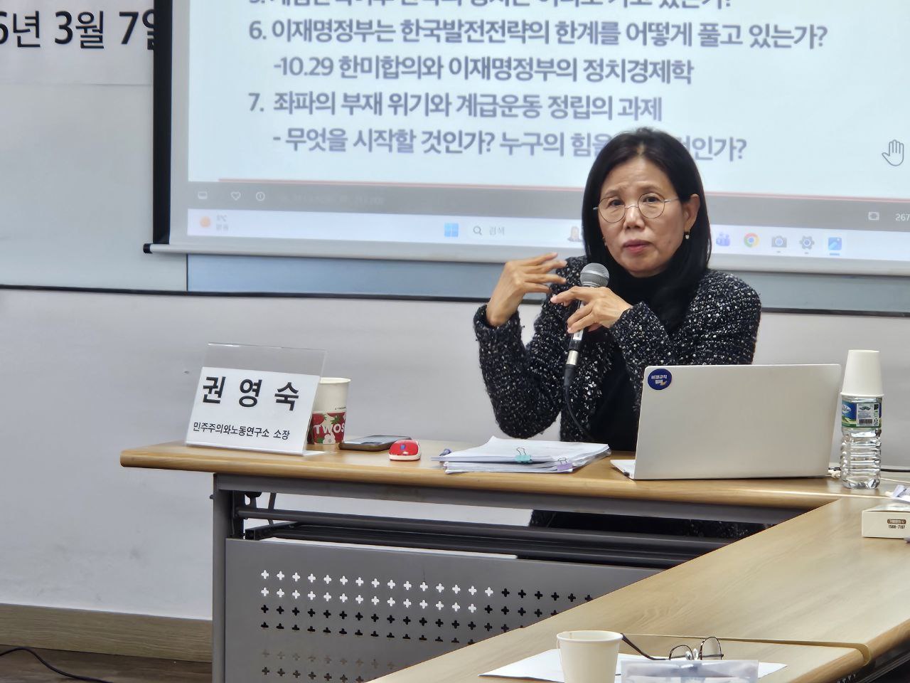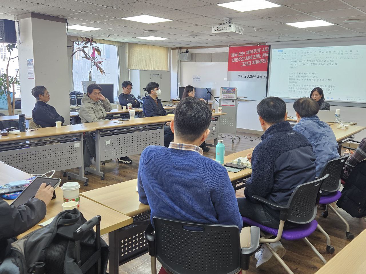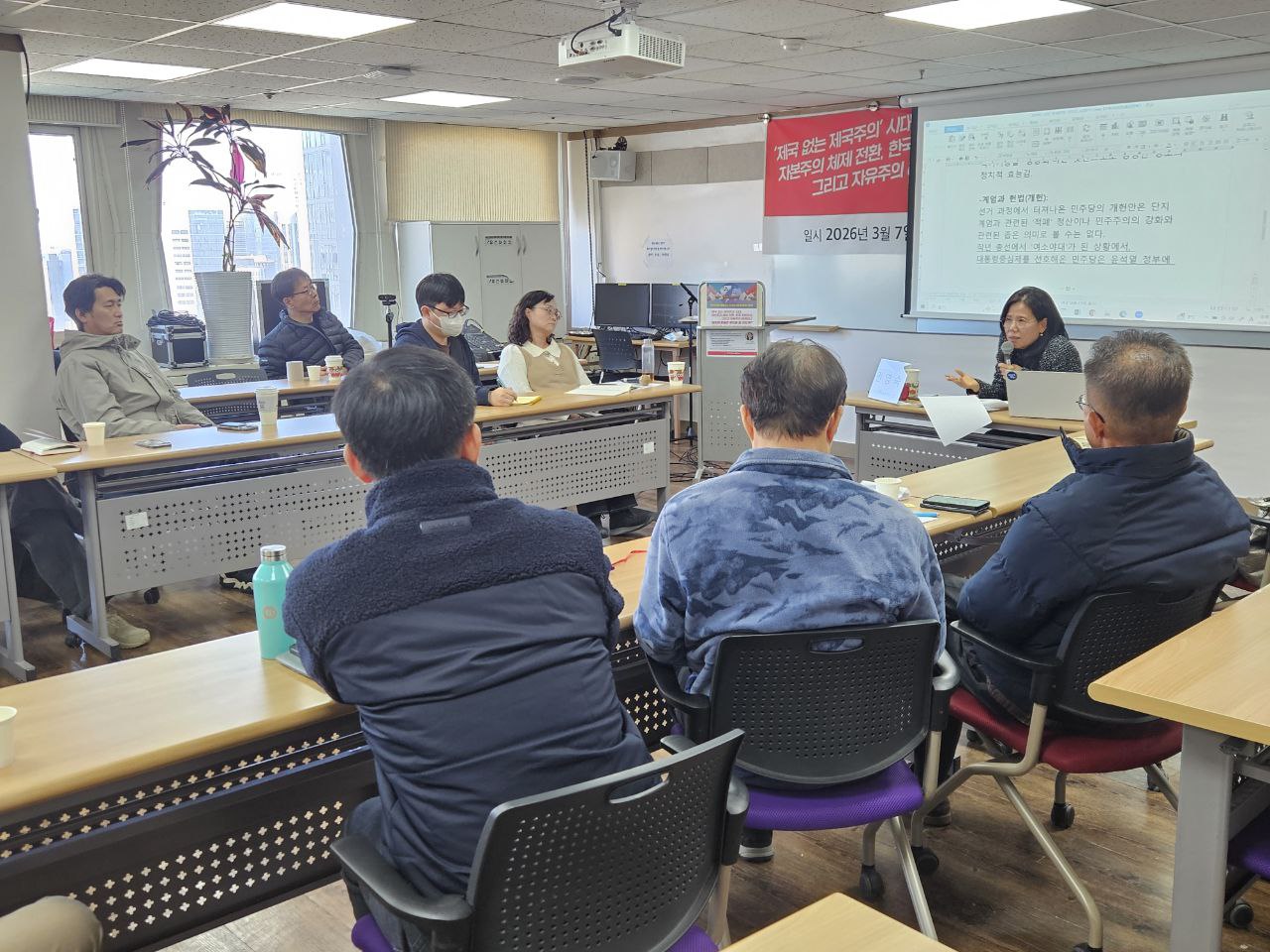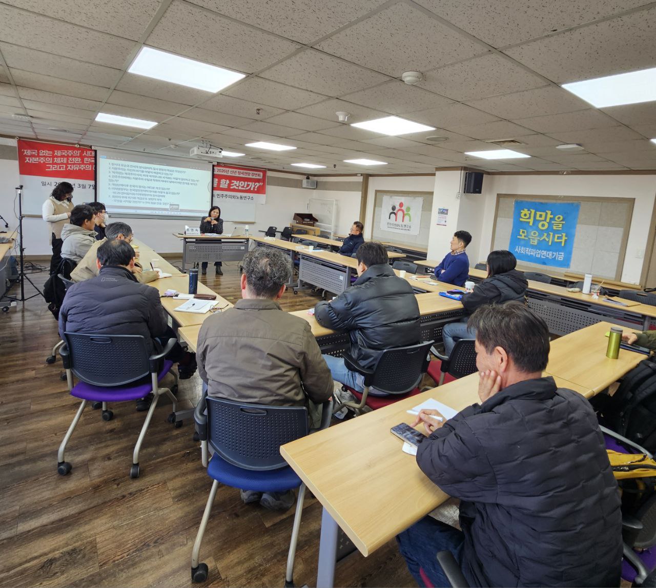 민주주의와노동 연구소의 2026년 신년정세전망 강연 및 토론이 지난 3월 7일 서울 민주노총 교육장에서 진행되었습니다. ‘제국 없는 제국주의 시대, 자본주의 체제전환과 한국 자본주의, 그리고 자유주의 헤게모니’라는 주제로 강연을 해주신 권영숙 소장님과 함께 고민을 나눠주신 모든 동지들께 깊은 감사의 인사를 전합니다.