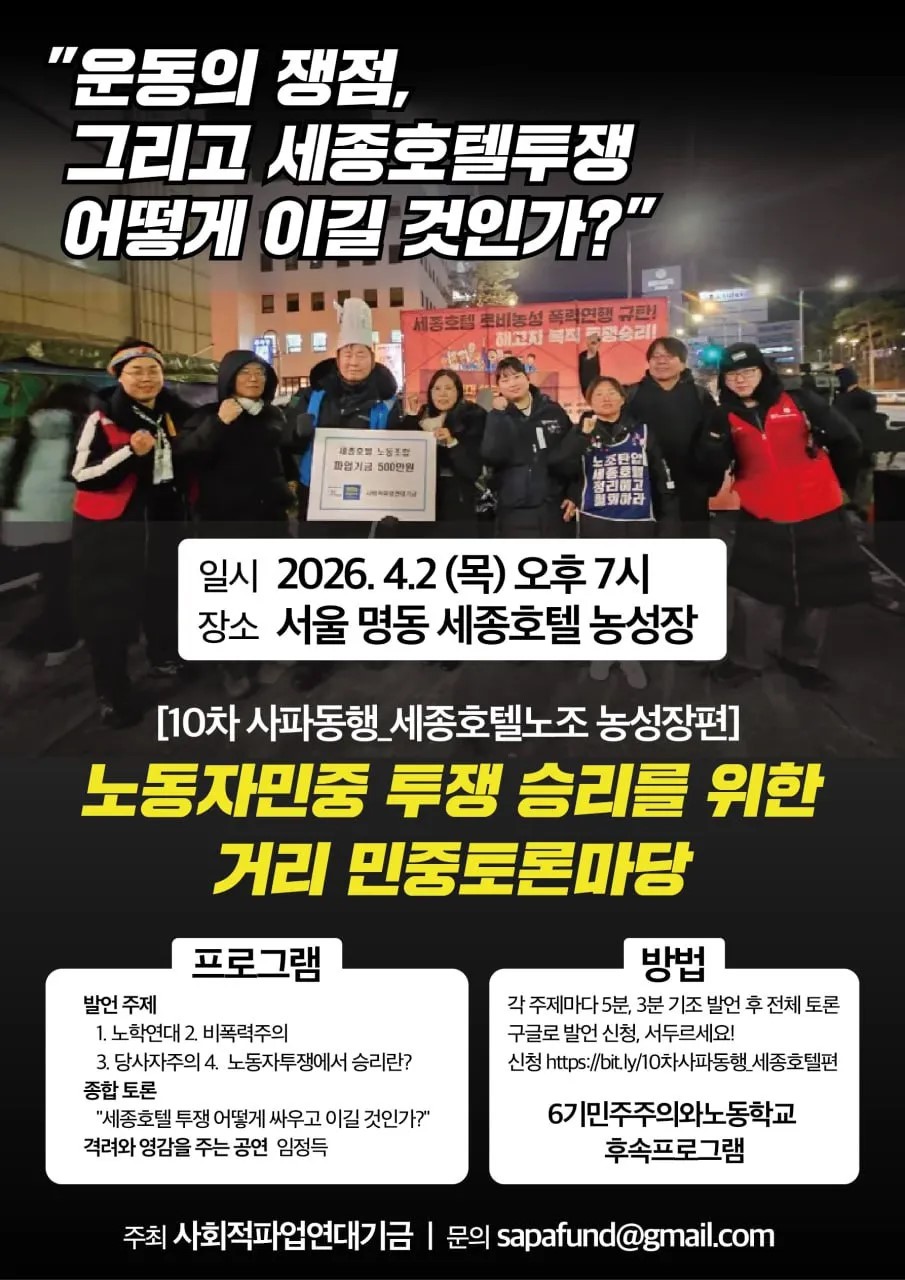 2026년 4월2일 오후 7시 서울 명동 세종호텔앞 노조 농성장에서 개최합니다.